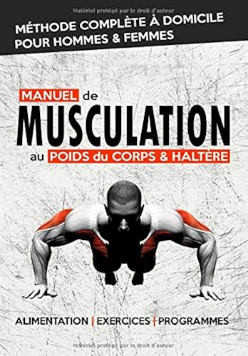 [AVERTISSEMENT de L'AUTEUR] Ce livre pour homme et femme en UN SEUL volume reste en vente, MAIS a été remplacé par une version homme et une version femme dissociée dans un soucis pédagogique. Le contenu reste globalement identique, mais a été optimisé sur le fond et la forme. Le manuel #Homme est déjà disponible sur Amazon et le manuel #Femme le sera prochainement. Titre des livres à copier/coller dans la zone recherche d'Amazon: ou cliquez sur la page auteur.• Manuel de Musculation à Domicile #Homme : Méthode de Nutrition et d'Entrainement Poids du Corps & Haltère• Manuel de Musculation à Domicile #Femme : Méthode de Nutrition et d'Entrainement Poids du Corps & Haltère*********************************************************************************L'objectif majeur de ce livre de musculation pour débutant est de vous fournir TOUT ce qui est fondamental de connaitre en musculation y compris en dépêtrant le vrai du faux. Ce livre de musculation pour homme et femme est synthétique pour faciliter la compréhension mais tout ce qui est utile à l'hypertrophie y est.Le but secondaire est de vous proposer une méthode générique et personnalisable qui combine le meilleur du poids du corps et de la fonte de façon à pratiquer chez soi sans se ruiner en matériel (paire d'haltère, barre de traction et station à dips).- La musculation au poids du corps est naturelle et super intuitive mais trouve ses limites à un moment donné pour réussir à adapter le principe fondamental de surcharge progressive.- La musculation avec haltères en fonte fait appel aux muscles stabilisateurs et s’adaptent parfaitement à la progression mais nécessitent beaucoup de lest et un banc. En piochant dans le meilleur de ces deux mondes, on obtient une méthode de musculation à domicile, mais aussi transposable en salle de fitness via des adaptations mineures.VOUS Y TROUVEREZ (ENTRE AUTRES) : • Les grands principes et techniques d'entrainement de base y compris les exercices à pratiquer, le nombre de séries et de répétitions, les temps de repos, amplitudes... mais aussi les techniques anti-stagnation.• De solides notions d'anatomie avec illustrations pour être en mesure d'en tirer des conclusions.• Comment éviter les blessures en fonction de votre morpho-anatomie.• La vérité sur le dopage et votre niveau musculaire atteignable de façon naturelle.• Les stratégies de progression globale, pour développer un point faible, stratégie muscle par muscle selon sa génétique. • Tout sur l'alimentation pour le muscle ! Que ce soit les bases théoriques, la prise de muscle ou la perte de masse grasse, comment vous constituer une diète personnalisée et même un exemple de plan alimentaire modulable à suivre.• Les compléments alimentaires pertinents en fitness/santé.• Des exercices de musculation, d'échauffement et de souplesse détaillés avec illustrations et pouvant être pratiqués à la maison sans matériel.• Des programmes de musculation simples et efficace du niveau débutant au niveau confirmé via un exemple d'utilisation cohérente du Full Body, Half Body et du Split.• Un programme de remise en forme et perte de poids et de conservation des acquis musculaires. • Un programme de cardio-training en endurance pour aider à obtenir une condition physique complète tel un boxeur.• Des astuces motivation et d'optimisation du mental pour réussir à persévérer sur la durée et atteindre vos objectifs.• Une FAQ de 14 pages sans langue de bois pour tordre le cou aux "mythes et légendes" encore trop présent dans le monde du fitness.Finalement, ce guide de musculation à domicile avec peu de matériel est destiné aux hommes et femmes motivés qui souhaitent des résultats notables et rapides tout en ciblant le meilleur ratio en temps/effort.
